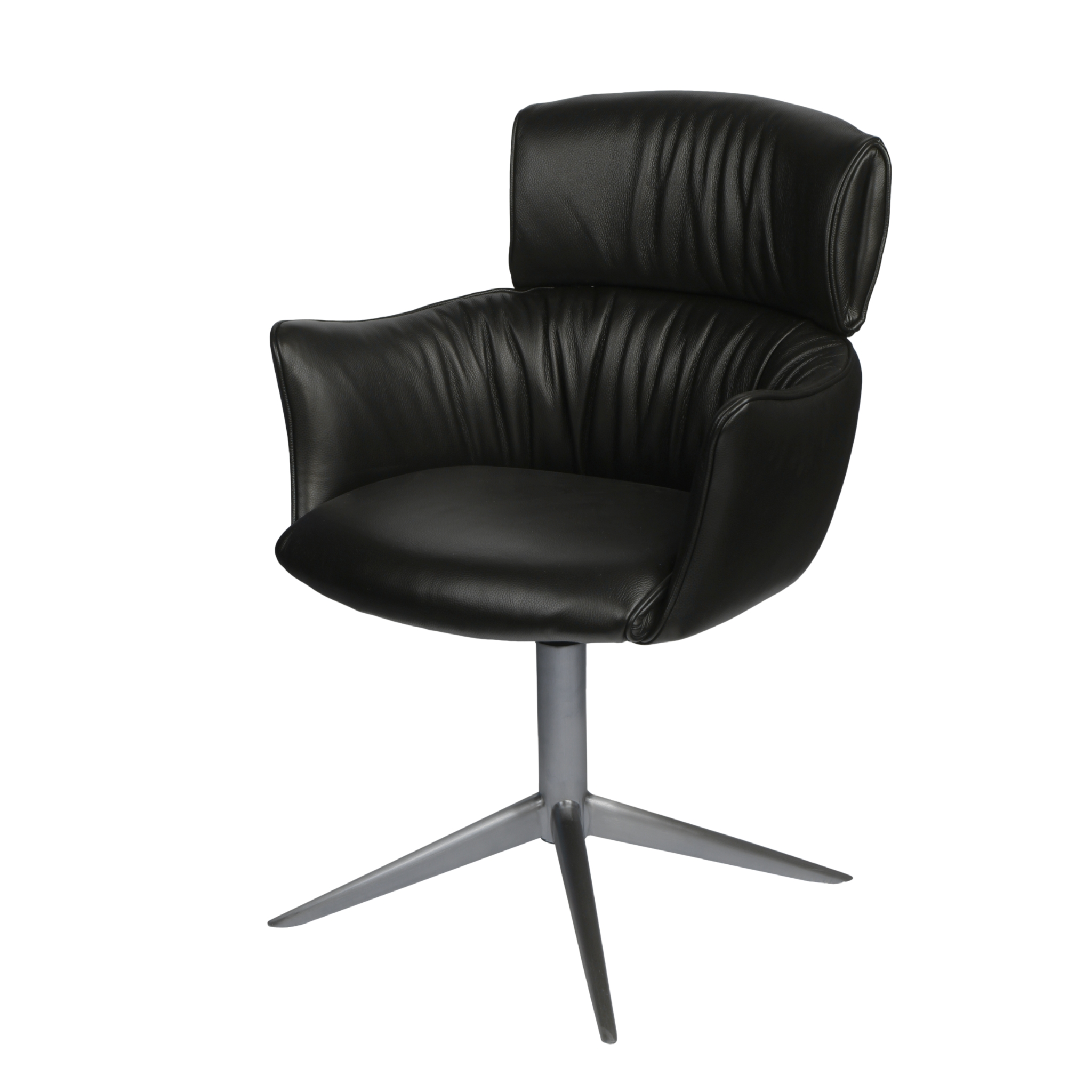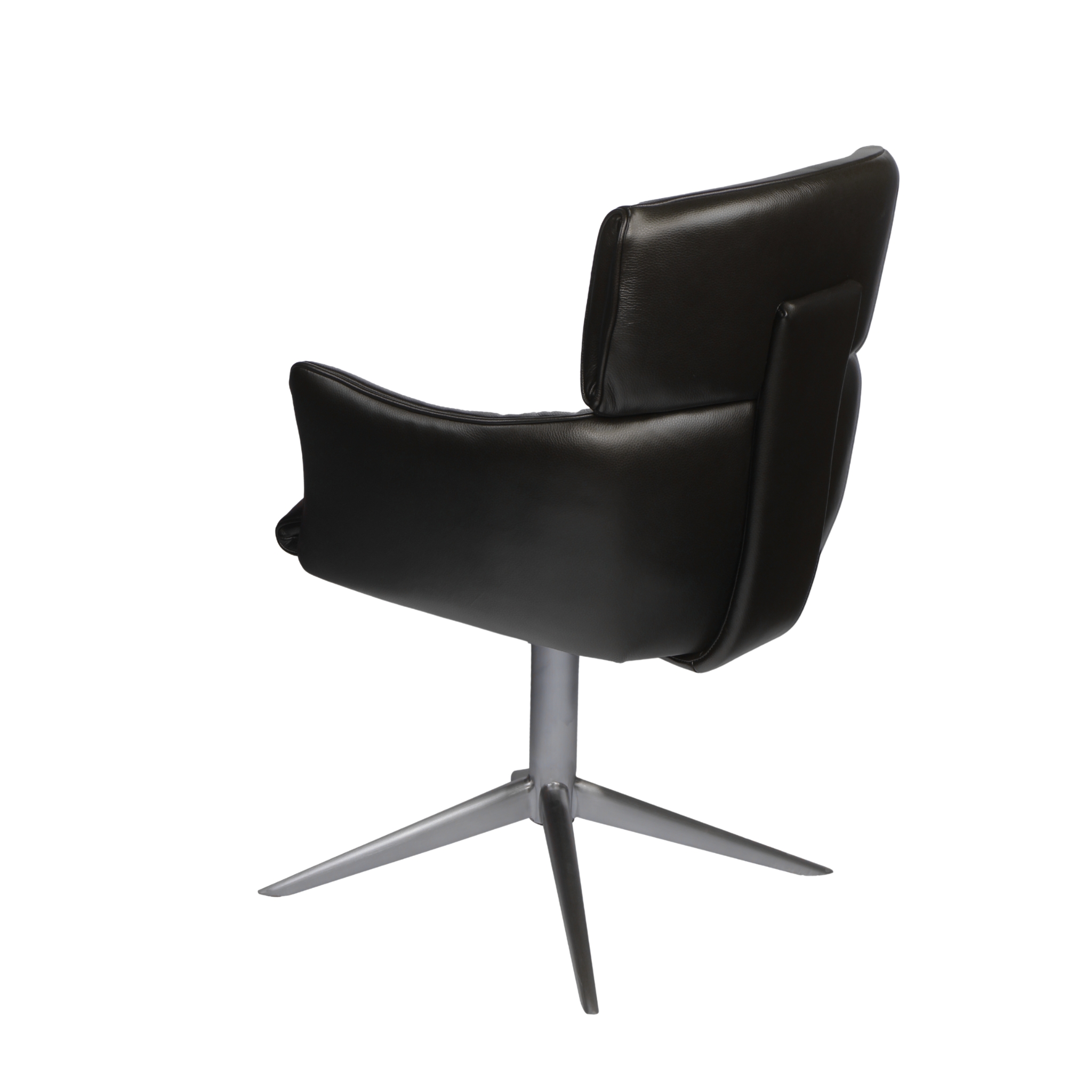 Det børstede stel giver et varmt, moderne touch og står i flot kontrast til læderets glatte overflade. Retur-drejefunktionen gør det lettere at sætte sig og rejse sig, hvilket øger komforten uden at gå på kompromis med stolens slanke profil. Model Alfred er designet med fokus på ergonomi, så lange middage eller arbejdsdage ved spisebordet opleves behageligt.