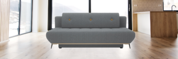 Sovesofa Villads grå med egetræs knapper og lister.