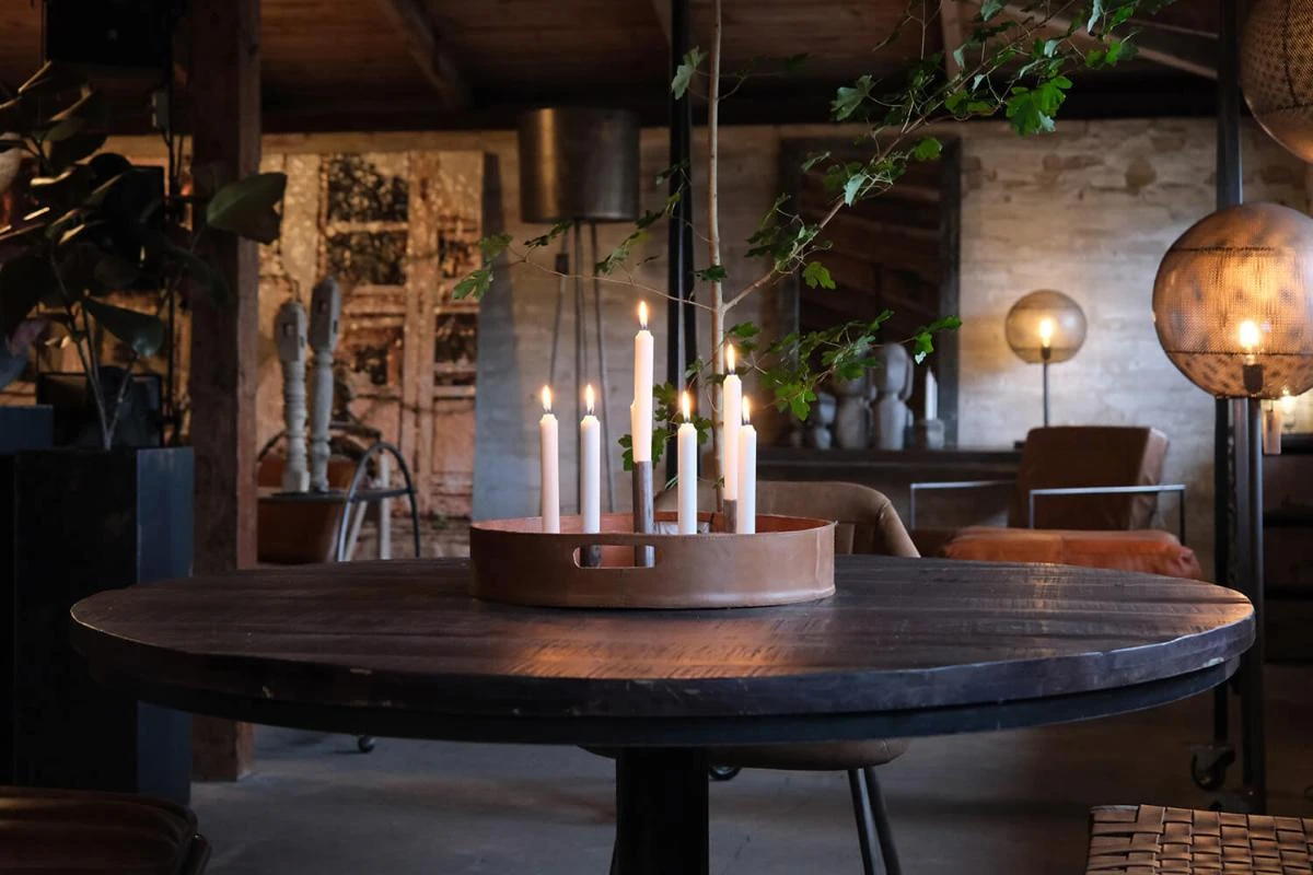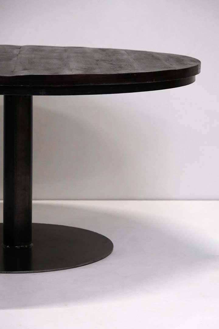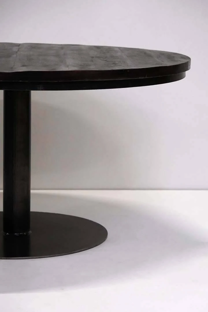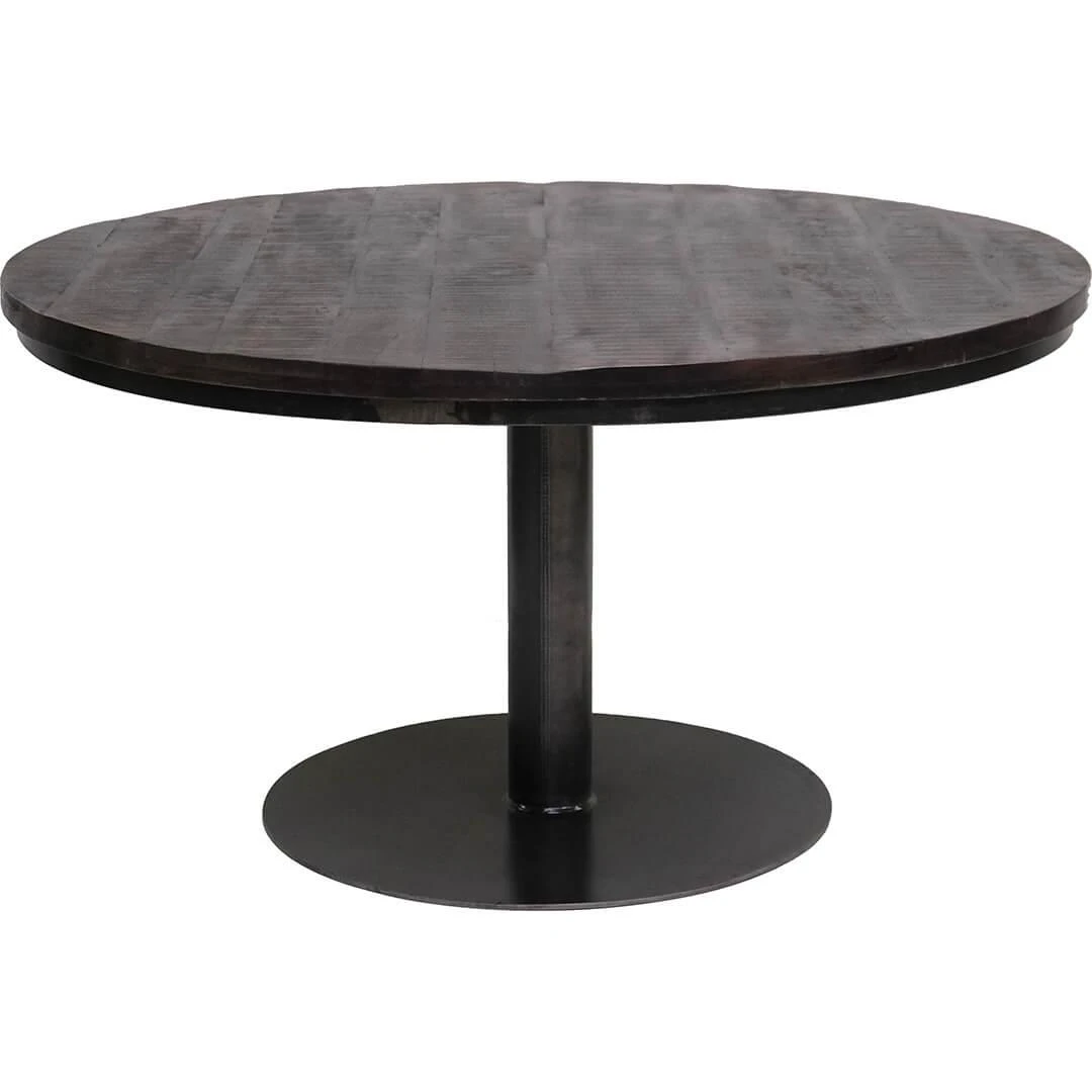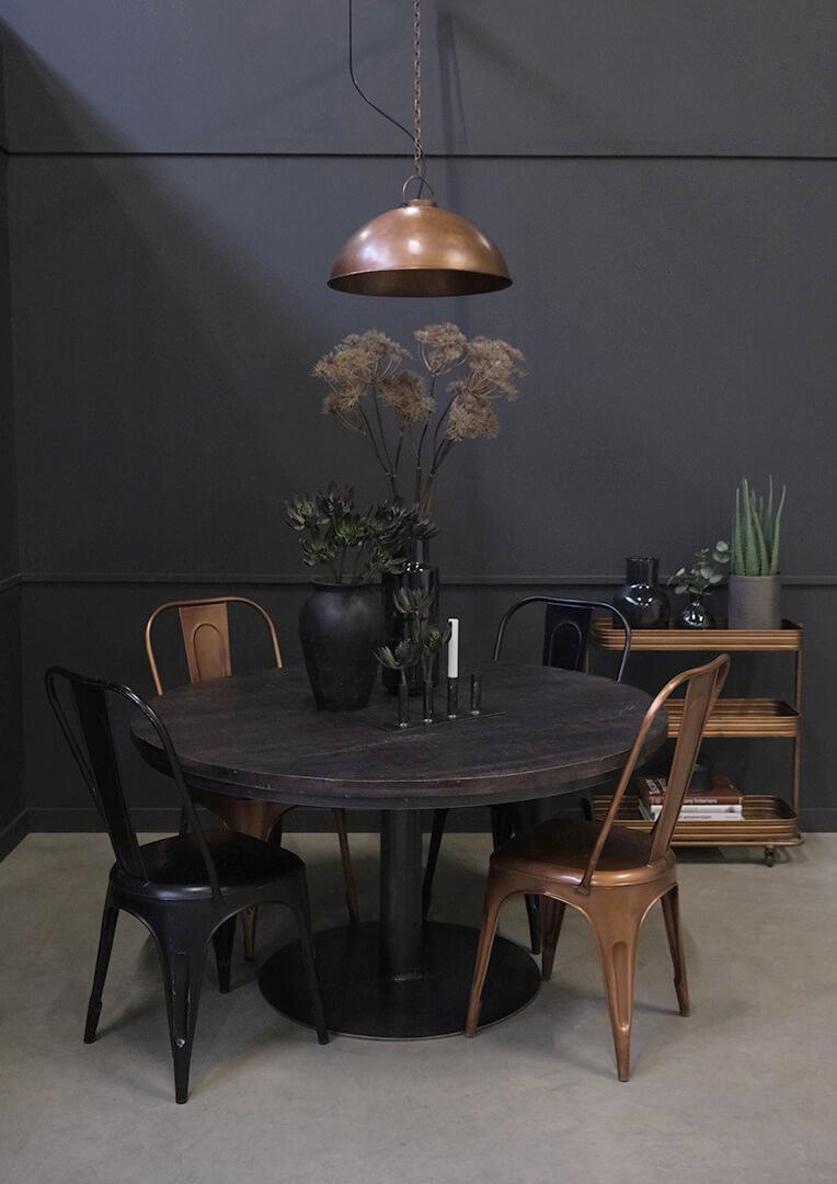 Dette runde spisebord i sortmalet massivt mangotræ kombinerer robusthed med et stilrent, industrielt udtryk. Den mørke bordplade hviler på en kraftig metalfod, som giver et stabilt fundament og et moderne look. Med en diameter, der giver plads til op til 8 personer, er bordet perfekt til hyggelige middage og sociale sammenkomster. Afstanden fra gulv til underkant er ca. 70,5 cm, hvilket sikrer god benplads. Et ideelt valg til både restauranter og private hjem, hvor rå materialer og tidløst design går hånd i hånd.